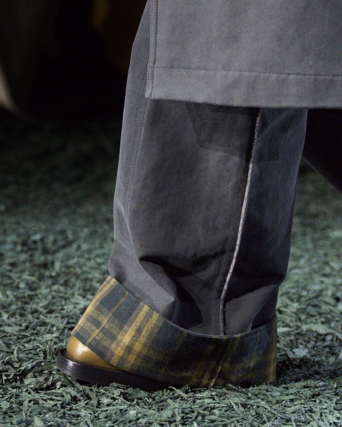 For next autumn, Daniel Lee prepared for us a wardrobe of cozy knits with fringes, long almost touching the floor leather, kilt and pleated skirts (with checked insides, of course), matched with coolest V-neck sweaters. A great styling trick, some of Lee’s models were wearing checked scarves on their heads, and did look like British football fans. Later, backstage Lee said that it’s also a nod to the late Queen Elisabeth II, who famously loved covering her hair with a scarf, when taking a walk with her corgis in her favourite Balmoral Castle in Scotland.