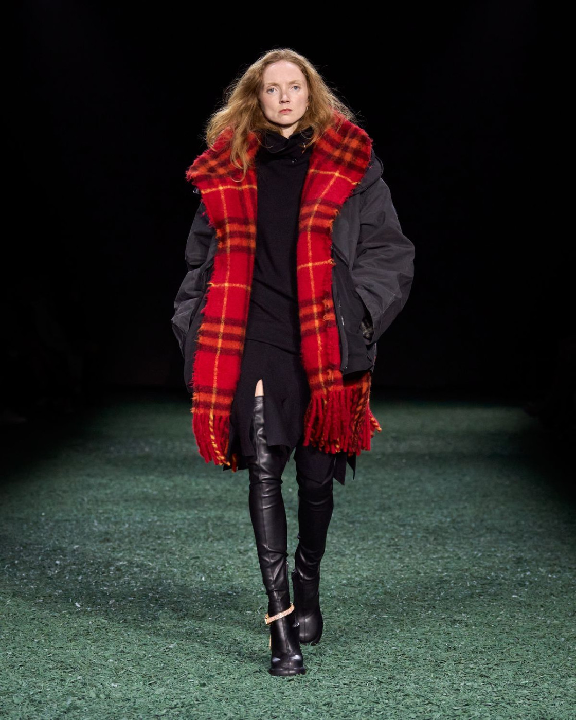 Another British icon was on the soundtrack: Daniel Lee chose his favorite hits from Amy Winehouse (think, “You Know I'm No Good”, “Back to Black” and “Half Time”). His cast was quintessentially British, as well. Veteran model Agyness Deyn opened the show in a gray wool trench, followed by Lily Cole (her look with the red scarf and cuissard high boots was a show-stopper), Lily Donaldson, Karen Elson and Naomi Campbell, who gorgeously marched in a sparkling crochet evening gown in the hue of moss that would cost a fortune. What other surprises did Daniel Lee have in stock for us? No one could have expected that Maya Wigram, Phoebe Philo’s daughter, would close the show in a leather jacket and a kilt, clutching a black umbrella in her hands.