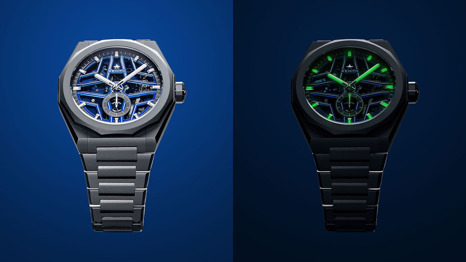The gradient night sky dial concept returns in the DEFY Skyline Skeleton Night Surfer El Primero, but takes on a new form and more dramatic execution. The open dial features a large central four-pointed star element, which is perfectly incorporated into the skeletonisation of the movement’s blue bridges and main plate. The dial’s metallic blue colour darkens from the bottom to the top, evoking the fading light on the horizon right after sunset. As a nod to the original Night Surfer, which featured the ZENITH applied star logo in Super-LumiNova, the entire four-pointed star on the dial is highlighted with luminescent lines that come to life in the dark, making the star that much more visible and brighter. Positioned at 6 o’clock, the dial features a unique feature among skeleton watches: a running 1/10th of a second indicator